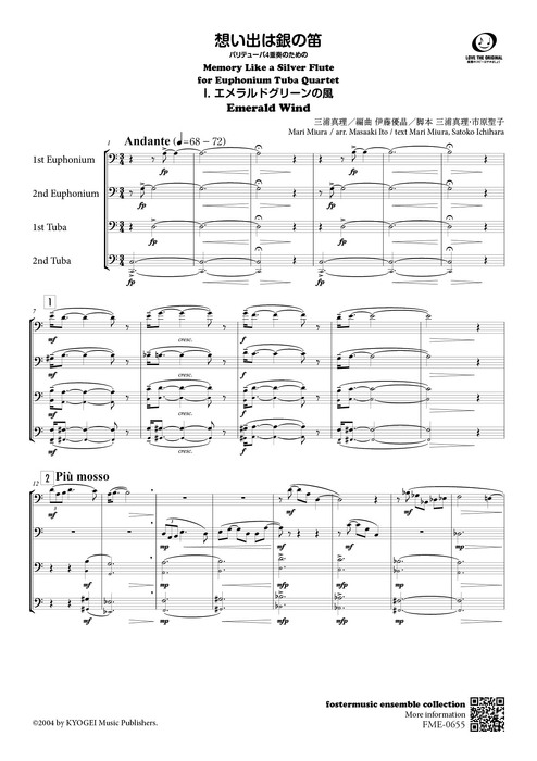 商品説明 その後、ユーフォチューバカルテットでアレンジし直してほしいと再打診を受け、厚木王子高校吹奏楽部のご協力のもと完成し、2025年11月に昭和音楽大学の「昭和ユーフォニアム・チューバアンサンブル」によって初演されました。音域の高い所は下げても大丈夫ですが、メロディーラインは埋もれないように注意してください。3楽章はスウィングしてもそのまま演奏しても大丈夫です。あえてアーティキュレーションはそれほど記載してないので、自由に演奏してもらえたら嬉しいです。(伊藤優晶)編成:Eup. 1/Eup. 2/Tuba 1/Tuba2 商品番号 BS00115251 ジャンル 管楽器、アンサンブル楽譜、ユーフォニウム(バリトンB.C含)、チューバ(バス含) 編著者 伊藤優晶 初版日 2025年11月06日 JANコード 4595059851537